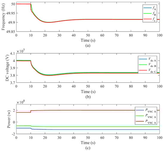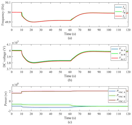 At 10 s, a load increase of 45 MW in area C was simulated. Before t = 10 s, area A and area B transmitted 100 MW and 60 MW of active power to area C through the DC grid, respectively. At t = 10 s, the load in area C increased 45 MW suddenly; the response waves of the frequency of each AC area, the DC-side voltage, and the transmission power of each converter are shown in Figure 8. The response of the traditional control method [25] is shown in Figure 9.