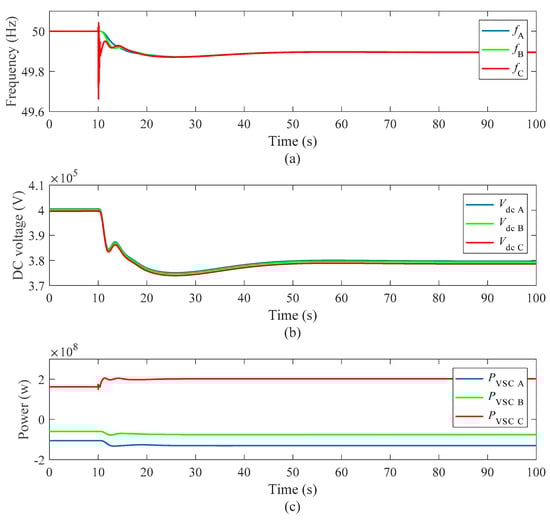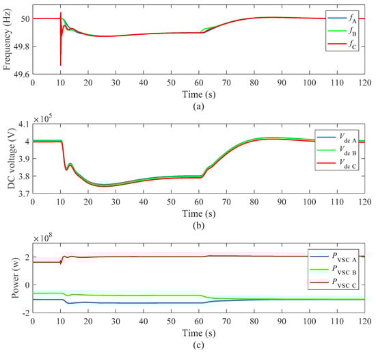 The waveforms of disturbances occurring in area C: (a) AC frequency of each sub-AC system; (b) DC-side voltage of each converter station; and (c) transmission power of each converter station.