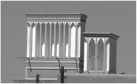 For centuries, people living in the Middle East have used various passive cooling systems to provide pleasant cool air [1,2,3,4,5] and cold drinkable water [6,7,8,9,10,11,12,13,14,15] during the hot summer months. One of these systems is the wind tower, or wind catcher, which creates passive ventilation and provides thermal comfort for the building inhabitants. Traditional wind towers are still employed in some countries of the Middle East, such as Iran, Egypt, Pakistan, Afghanistan and the UAE. Figure 1, Figure 2 and Figure 3 show traditional wind towers in the city of Yazd in Iran, Cairo in Egypt and Heydar Abad in Pakistan, respectively. These wind towers naturally ventilate buildings.