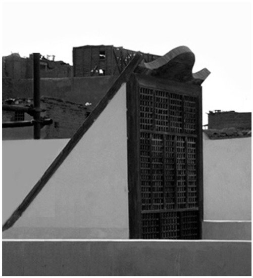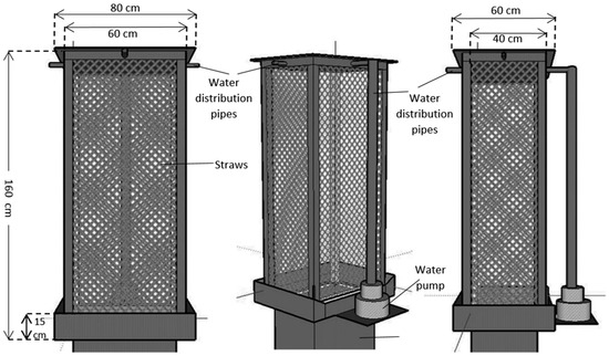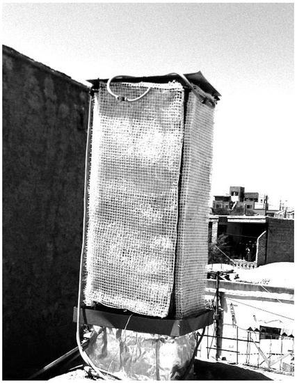 - Wind tower with wetted surfaces: In this type of wind tower, pads or straw are placed at the top of the wind tower column (wind tower head). They are wetted by means of an electric water pump (Figure 5) [3,36]. The water in wetted pads or straw is evaporated by the air at the wind tower head (the highest part of the wind tower column where air inlets are located) and decreases the air temperature (similar to the evaporative cooling process in evaporative coolers) [3,28,36]. Since the contact surface between the air and wetted straw is extremely large, the moisture in the air will increase. The difference of density between ambient air and the air inside the head of the wind tower, as well as the height of the wind tower column, produce a pressure dissimilarity, causing a downward airflow inside the column. The difference of density at the topmost point of the column (wind tower head) and the ambient air increases the buoyancy effect [3,28,36]. Therefore, it is expected that in places where the wind speed is low, or the ambient air is still, this type of wind tower will be more effective.