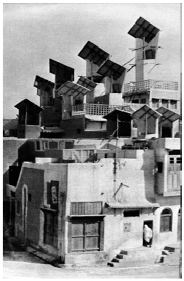 View of wind towers or wind scoops in Heydar Abad, Pakistan [22].