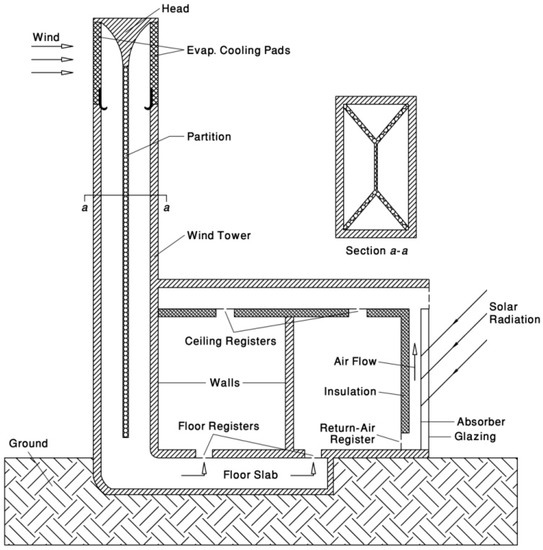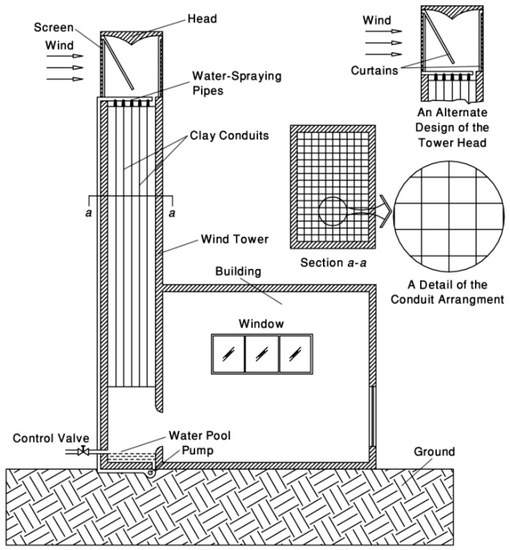 More than forty percent of all of the energy in the world is used in buildings, and air conditioning, heating and cooling systems employ over sixty percent of all energy used in buildings [16,17,18]. Thus, passive cooling systems, such as wind towers or wind catchers, can help reduce the energy needed for air conditioning in buildings, especially at peak times. It should be noted that traditional wind towers have some restrictions. Several researchers proposed new designs of wind towers to use in windy and hot, dry zones to improve the performance of conventional wind towers [19,20].
