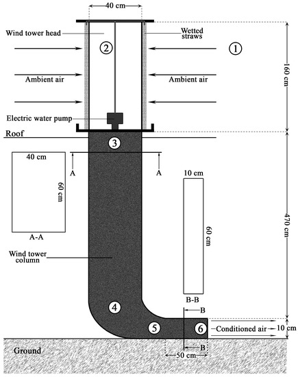 - Dry bulb temperature, RH and wind velocity of the ambient air (Point 1 in Figure 8) and of the conditioned air at the outlet of the wind tower (Point 6 in Figure 8);