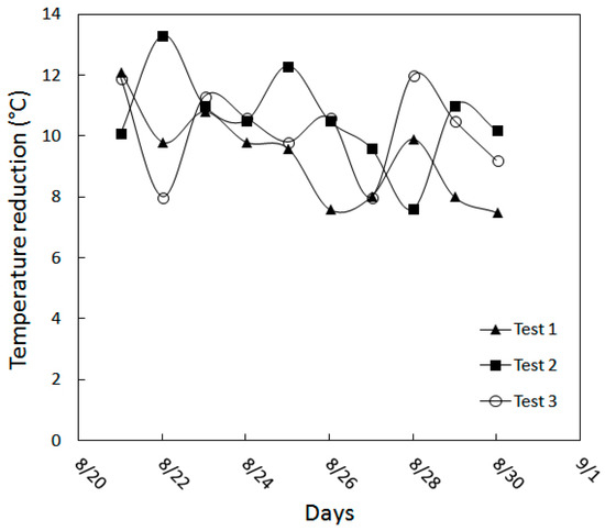 The amount of reduction in temperature for test Nos. 1, 2 and 3 (21 to 30 August 2013, 10:00 a.m., 12:00 p.m. and 4:00 p.m.).