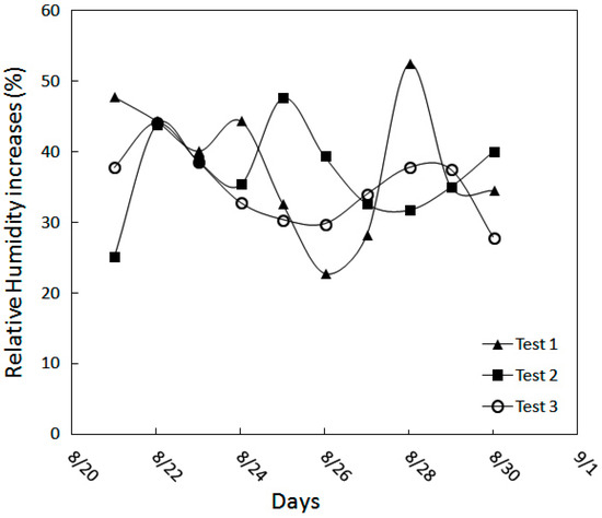 The amount of increase in RH for test Nos. 1, 2, and 3 (21 to 30 August 2013, 10:00 a.m., 12:00 p.m. and 4:00 p.m.).