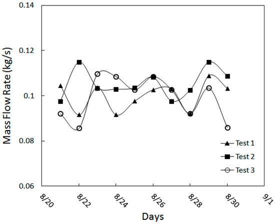 The mass flow rate entering the room from wind tower outlet for test Nos. 1, 2 and 3 (21 to 30 August 2013, 10:00 a.m., 12:00 p.m. and 4:00 p.m.).