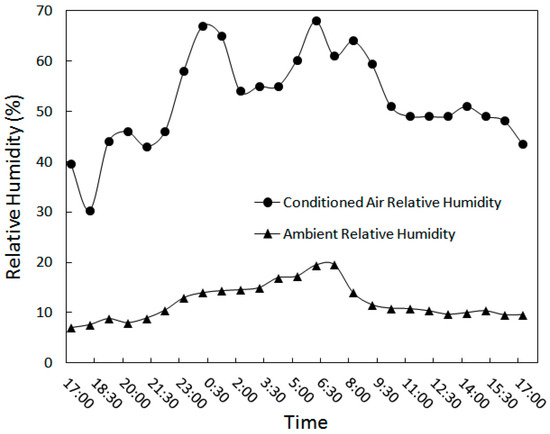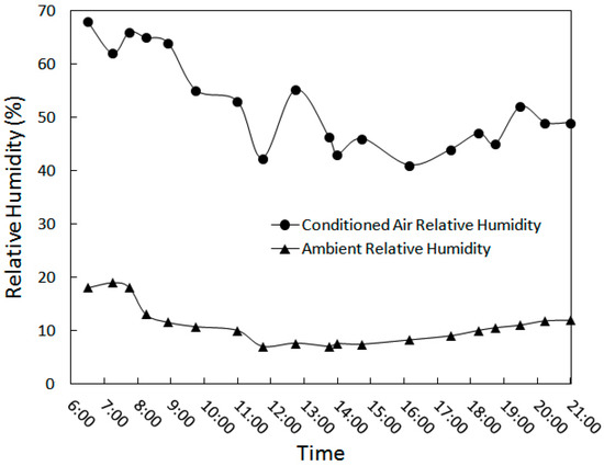 Note that the above maximum value of RH (19.6%) was measured in the middle of the night and early morning. If midnight measurements were ignored, the average RH of ambient air was around eight percent. Furthermore, the highest, lowest and average RH of air entering the room from the wind tower outlet were as follows: