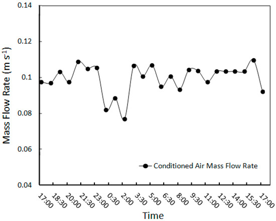 The conditioned air mass flow rate from the wind tower outlet to the room for test No. 5 (from 5:15 p.m. on the 22nd to 5:15 p.m. on the 23rd of August 2013).