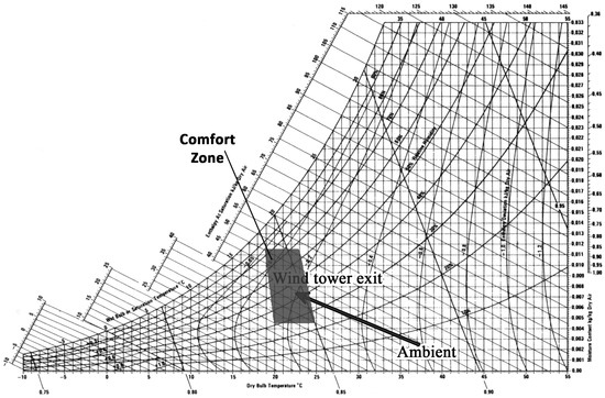 To show a more tangible performance of the proposed wind tower, Figure 19 displays the air property changes at a sample point by using a modular wind tower with wetted surfaces on a psychrometric chart. A psychrometric chart is a graphical illustration of changes in the physical and thermodynamic properties of air. In the psychrometric chart, there is a zone called the comfort zone, which represents thermal comfort conditions, and air conditioning systems designed by engineers must be able to provide indoor air conditions in that zone [42]. Sample data shown in Figure 19 were taken at 13:45 on 26 August 2013. The direction of the arrow in the psychrometric chart indicates ambient air changes by cooling and humidifying processes while passing through the wind tower. As can be observed in Figure 19, RH of ambient air increased from 7% (ambient air) to 44.3% (at the wind tower outlet). Furthermore, ambient air temperature decreased from 37.2°C to 22.5 °C. As a result, the proposed modular wind tower can provide conditions of greatly increased comfort for building inhabitants.