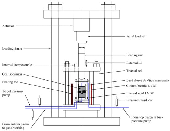 Schematic of the HPHT triaxial apparatus and instrumented coal specimen.