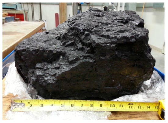 A coal block from the Genesee coal mine in Central Alberta, Canada. (Note: The measuring tape’s divisions are in inches).