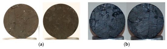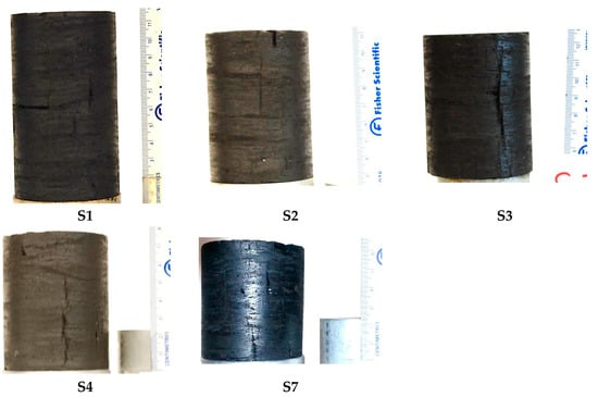 Most of the cores broke along bedding plane discontinuities; hence, none of the specimens were twice as long as their diameters as recommended by ASTM D7012-13 [28]. A diamond drill bit with 2–1/2 inches nominal outer diameter was utilized which resulted in cores with dimeters of 6.1 cm. No additional work was done to adjust dimeter of the cores; however, they were end-trimmed using a lathe machine and specimens with fairly flat end surfaces were produced. No specific measurements were conducted regarding initial moisture content as well as any potential moisture loss and/or gas desorption during the coring process. Ten specimens were obtained with lengths between 5.6 and 10.6 cm; however, five of them were successfully tested in this study. Figure 4 shows pictures of those specimens prior to testing. Vertical fractures (face and butt cleats) and bedding plane fissures were observed in all samples. The specimens even possessed dissimilar natural fracture networks in two end surfaces. The heterogeneous cleat networks in two end faces of S4 and S7, as an example, is shown in Figure 5. Dimensions of the tested specimens are summarized in Table 3.
