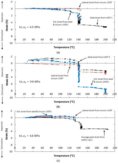 Height of specimen S3 increased by more than 1% as temperature increased from room temperature to approximately 30 °C. Further heating caused a slight reduction in height. At 140 °C, axial strain dropped to nearly 1.9% (contraction) which further gradually dropped to about 2.6% compressional strain at 200 °C. Heating caused gradual lateral contraction. Lateral strain was about 0.5% contraction at 140 °C which was followed by a collapse to about 2.6% contraction at 140 °C. Increasing temperature gradually escalated radial contraction to more than 3.0% at 200 °C (Figure 6b). The volumetric strain curve had a similar trend to those of the axial and lateral strains. Maximum volumetric expansion was about 1.1%; however, at 140 °C, it dropped to about 6.8% contraction. Thereafter, volumetric contraction gradually increased to more than 9% at 200 °C.