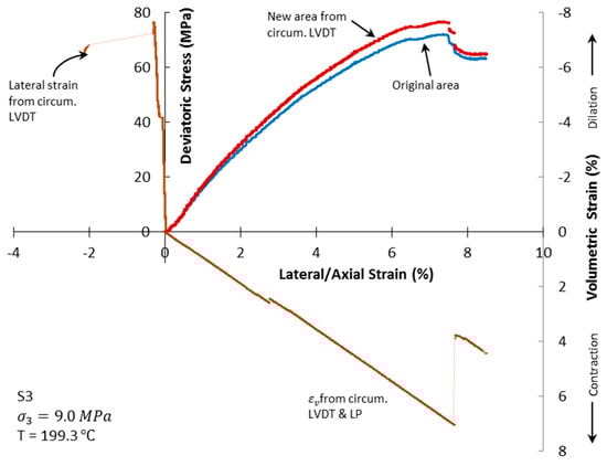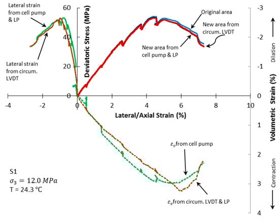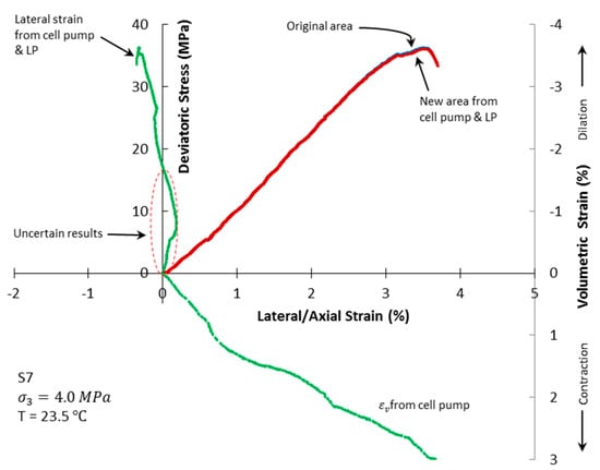 Specimen S7 was tested under . There was no circumferential LVDT available for this sample; however, lateral and volumetric strains were calculated from the cell pump volume change and an external LP (Figure 8). Similar to S1, using original cross section area and the deformed area (concluded from the cell pump and LP) did not result in a significant deviation in the stress-strain curves in the pre-peak region. The peak deviator stresses using the original and deformed area were equal to 36.33 and 36.10 MPa, respectively. The corresponding peak axial strain was 3.51%. Figure 8 also shows lateral strain curve of S7. Lateral strain initially was compressional which later changed to extensional. Although the initial portion of the lateral strain curve seems uncertain, it is used here. One possible reason for this uncertain region could be fluctuations of room temperature; therefore, cell pump compliance. Lateral strain at peak was determined equal to 0.32% (extension).