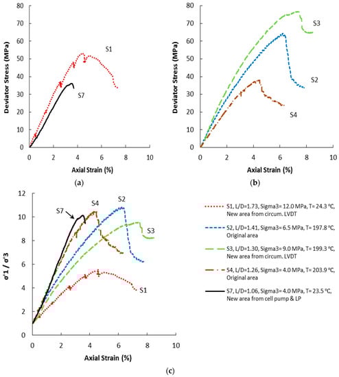 None of the tested specimens satisfied the length-to-diameter ratio requirement by ASTM D7012-13 [28]. According to ASTM D7012-13 [28], L/D needs to be between 2.0:1 and 2.5:1 and specimens with L/D less than 2.0:1 are unacceptable. According to other researchers [39,40], specimens with L/D less than 2.0:1 exhibit larger strength compared to specimens with L/D equal to 2.0:1. Despite the small L/D of the specimens, they were utilized since longer specimens could not be obtained. ASTM D7012-13 [28] does not suggest any correction factor for the L/D effect; hence, no correction was done in this regard. Principal stress ratio () for all tests are plotted against axial strain in Figure 10c. From both room temperature and 200 °C tests, it was concluded that increasing generally resulted in smaller .