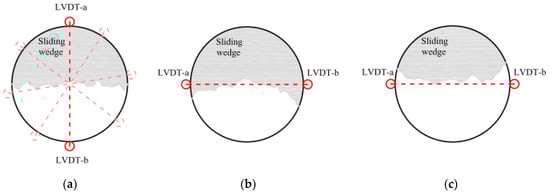 Different realizations for positioning of internal axial LVDTs in cross-section of a specimen with respect to a slidig wedge which may form at a later time during deformation: (a) LVDTs on opposite sides; (b) both LVDTs adjacent to the sliding wedge; and (c) both LVDTs outside of the sliding wedge.