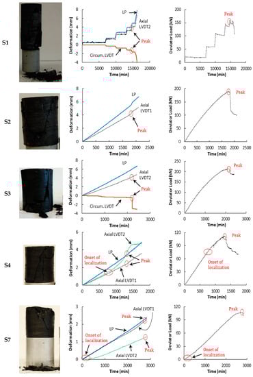 The post-test observation for S4 was that both LVDT1 and LVDT2 were mounted outside of the area which was severely damaged during shearing; hence, they moved downward less than the LP. This observation was similar to the case shown in Figure 12c. At the time 725 min, LVDT2 started to deviate from LVDT1 which can be an indication of major shear plane development (onset of localization). This time corresponded to a deviator load and stress of 73 kN and 25 MPa, respectively. This deviator stress corresponded to 65% of the peak stress. Significant increase in slope of the axial LVDTs curves were noted at the peak stress.