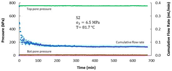 Figure 14, as an example, presents upstream/downstream pressure as well as cumulative flow rate curves for permeability measurement on S2 at 81.7 °C. After about 420 min, equilibrium flow rate at the ISCO pump was attained. Similar curves were generated for each specimen, at any temperatures and differential pore pressures. Nitrogen viscosity as a function of temperature and average pressure in specimen was taken from NIST [43]. Experimental measurements along with the corresponding viscosity were input into Equation (3) to determine permeability. All reported permeability values are apparent permeability since effect of any existing water in the matrix on the testing results was not separated. Table 5 summarizes information regarding permeability tests for each specimen.