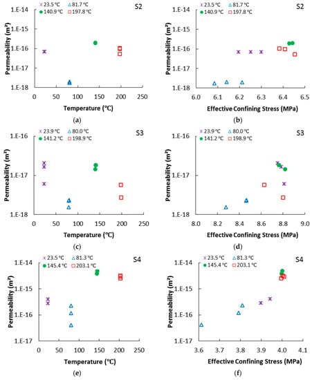 (a) Permeability of S2 versus temperature; (b) permeability of S2 versus effective stress; (c) permeability of S3 versus temperature; (d) permeability of S3 versus effective stress; (e) permeability of S4 versus temperature; and (f) permeability of S4 versus effective stress.