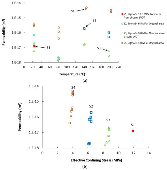 Variations of permeability with for these specimens are plotted in Figure 16b. In this figure, each family of data points at each belongs to a specific specimen but under different temperature. Based on this figure, permeability generally decreased as increased.