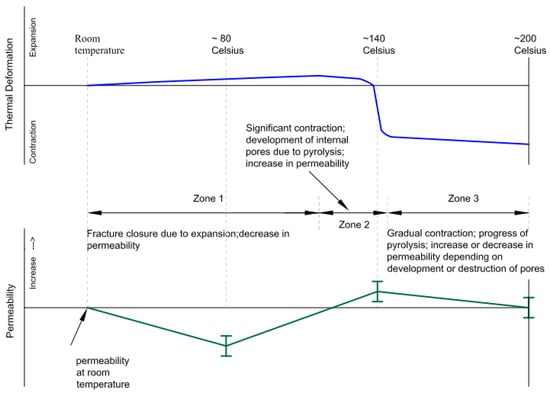 Fluctuations of coal permeability with temperature and were reported by other researchers [19,20,22,23,25]. The general trend of permeability with temperature was ascending in those works. Especially at ultra-high temperatures such as 500 °C or 600 °C, significant increase in permeability was observed. Nonetheless, at lower temperatures such as 100 °C or 200 °C, fluctuations in permeability were noted [23,25]. Based on our experimental results, a conceptual model was inferred for N2-permeability versus thermal deformation of the Alberta coal, which is depicted in Figure 17. Three zones could be interpreted from Figure 17 with different mechanisms of permeability evolution. The first zone existed from room temperature (about 24 °C) to a temperature between 80 and 140 °C. In this zone, the governing mechanism is gradual thermal expansion of the matrix which closed initial fractures; hence, reduced permeability. The second zone existed thereafter to a temperature just after 140 °C. The characteristic feature of the second zone was significant contraction of the specimen and simultaneous development of internal pores due to pyrolysis initiation; hence, increase in permeability. Beyond the second zone, there was a region with gradual contraction up to 200 °C (Zone 3). In this zone permeability may drop or increase, depending on development of new pores as a result of pyrolysis or structural collapse of some of the existing pores. One could justify this conceptual model by measuring porosity under temperatures and average effective confining stresses similar to permeability tests. Such porosity measurements need to be done utilizing gas within the same triaxial apparatus, perhaps based upon the Boyle-Mariotte law.
