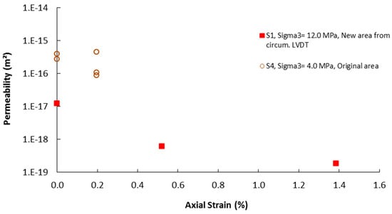 Permeability of S1 and S4 versus axial strain during shearing at room temperature.