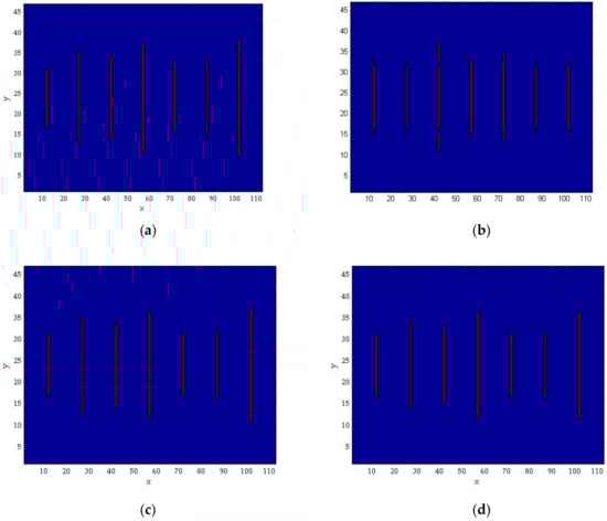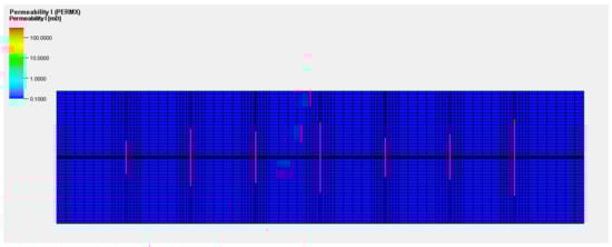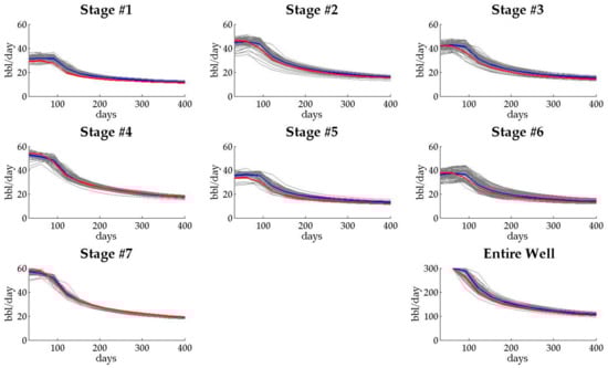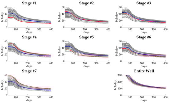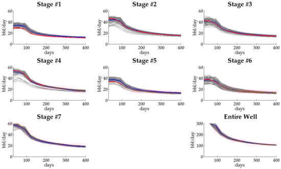 The oil production rates calibrated by history-matching for Case 1 are shown in Figure 5. The graph located in the bottom right indicates the entire oil production from the target well, and other graphs describe oil production rates from each fracturing stage. The red line indicates the “true” value from the reference field. The grey and blue lines indicate oil production rates from ensemble members, and their average, respectively. The estimate of oil production tends to be well-matched to the reference in the entire well aspect. However, in each fracturing stage aspect, the production behavior is significantly different to the reference field. The difference is reasonable in that history-matching for Case 1 is conducted using only production data from the entire well. Comparing permeability distributions between the reference field and the calibrated model, and in Figure 6a,b, it is found that the calibrated model does not represent the characteristics of hydraulic fractures at all. The reason is that it calibrates the model by only focusing on the entire oil production, and therefore, allocates total oil production to each fracture arbitrarily.