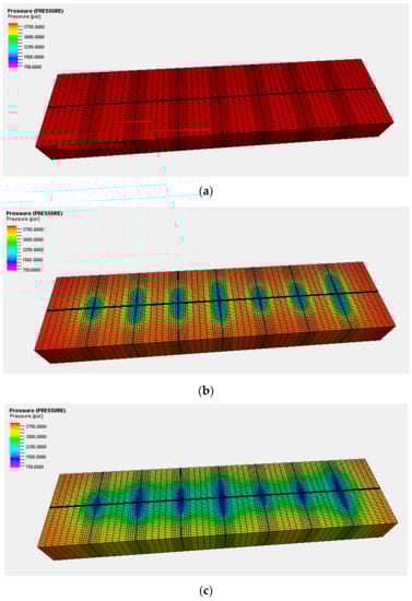 Evolution of reservoir pressure distribution during production: (a) initial pressure distribution, (b) pressure distribution after 1 year production, (c) pressure distribution after 6 years production.
