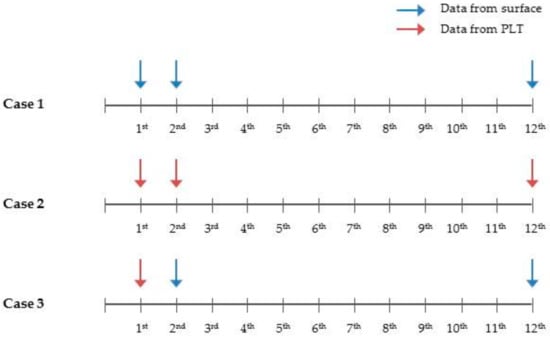 Considering these backgrounds, three case studies were designed to verify a proposed method for post-fracturing evaluation as seen in Figure 4. Case 1 is a control experiment for history-matching using only production data measured from the wellhead. Cases 2 and 3 are designed to quantify the effects of the PLT frequency on history-matching. Each case uses production data that incorporates PLT data surveyed three times, and once, respectively. The assimilations for all the cases are conducted three times at the 1st, 2nd, and 12th month.