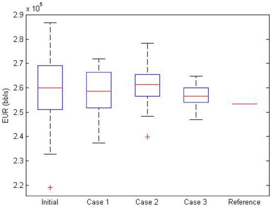 The ranges of EUR predictions for all the cases contain the “true” value, which is an EUR of the reference field. However, a prediction about the initial case has a huge range of uncertainty; thus, it does not have significant meaning as an estimate. The distribution of the initial case is symmetric based on the axis of the median. Fracture half-lengths of the initial ensemble are generated at random; thus, EURs calculated from the initial ensemble are distributed symmetrically.