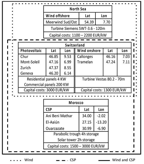 Third, Switzerland’s location in central Europe, and in bordering the Mediterranean region, makes it possible to consider two very different sources of imported renewable power. On the one hand, through Italy and an undersea cable, Switzerland could conceivably have access to concentrating solar power (CSP) from northern Africa [38,39,40]. Morocco has, besides appropriate climatological characteristics (mean Normalized Direct Irradiance larger than 2000 kWh/m2/year), a specific political scheme to foster CSP development [41,42]. Nevertheless, some implementation barriers need to be overcome, such as the lack of technical capacity among the civil service in solar projects [43]. Additionally, although private European investment is already in place, political support to CSP developments from European countries remains undefined. A potential benefit of CSP is that the integration of several hours’ thermal storage capacity, as has become the industry standard, means that CSP can be used to cover evening power demands, typically a peak load period after most of all of the PV capacity has gone offline [44,45]. Making CSP somewhat less attractive is that it is also seasonal, with a summer peak, although this is less pronounced than for domestic PV supply. On the other hand, through Germany, Switzerland has access to offshore wind coming from the North Sea [46,47]. After a time of some uncertainty due to public opposition [48], a project of 3 high voltage direct current transmission lines (HVDC) started in 2015, aiming to transmit high loads of electricity from the North Sea wind farms to the south of Germany [49]. This is attractive because of the relatively high capacity factor of wind, which is also highest in winter. Both CSP and offshore wind offer large capacity expansion potentials. We analyze whether either or both of these options would be needed in order to reach a target of 100% renewable power without additional storage capacity.