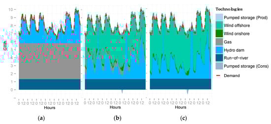 Figure 2 illustrates the relative roles of particular technologies, according to different scenarios. All three graphs show the week in the year when gas consumption in a carbon intensive scenario would be highest, occurring in the month of January. In Figure 2a it is clear that gas is the primary source of baseload power, augmented by run-of-river hydro. Figure 2b represents the use of gas as a bridging fuel, as captured by the Swiss Energy Strategy 2050, balancing the difference between wind load and consumer demand. Figure 2c illustrates a completely decarbonized scenario. In this case, there is overcapacity of wind. On the one hand, this allows for the system to achieve complete reliability without the use of gas. On the other hand, however, in such a scenario there would be many hours of the year (977 h) when wind power is curtailed: potentially generated, but simply not used anywhere in the system. This curtailment takes place entirely in the hydropower season; run of river plants mostly produce from late March to late November, showing that wind power is used as a backup to seasonally fluctuating hydropower. This curtailment, which in average over the entire year is 11%, leads to higher costs. There is no curtailment in the scenarios utilizing gas as a bridging fuel. However, curtailment reaches about 40% of the year in in the gas intensive scenario (about 3400 h), mostly concentrated in the summer months, where Swiss hydropower is producing at its maximum availability factor.