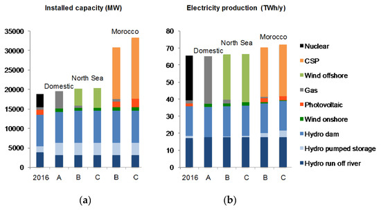 In both scenarios (B) and (C) we focus on domestic development of photovoltaic (PV) and onshore wind, consistent with the country’s energy strategy for 2050. We also supplement these resources with potential imports, either of wind power from the North Sea, or CSP from Morocco, or both. Figure 1 describes our assumption for these power plants, specifying the geographic locations and technologies involved. Both offshore wind and CSP are relatively unemployed technologies, for which issues of public acceptance could be fewer than is the case with large-scale onshore wind or PV installations in the European Union (EU) [53]. Offshore wind has the potential to grow rapidly in the EU. It accounted for 8% of new wind installed capacity in 2016 [54], driven by European and national policy targets towards carbonization [55,56]. A similar potential for growth exists in the case of CSP in North Africa. Many studies suggest the feasibility of MENA to provide up to 20% of Europe’s electricity by 2050 [9,13,57,58,59,60,61]. Compared to PV, CSP offers the possibility of relatively low cost on-site thermal storage. Several hours storage has become the industry standard, allowing CSP to cover peak load periods in the evening.