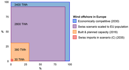 European energy economic potential of offshore wind, in perspective to the Swiss imports from North Sea in the carbon free scenario (C); planned production in 2016; and the Swiss consumption in the wind scenario scaled to the European level. Restrictions to the future technical potential development are applied according to economic, spatial planning, and social limitations. Data sources are [42,61,75].