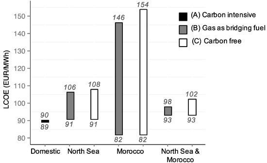 Ranges of weighted LCOE for the scenarios in the short term (2035). The costs have been calculated using technology cost projections of various authors for renewable technologies (shown in Figure 5), and may be open to some degree of debate. The costs in importing scenarios (North Sea and Morocco) are calculated for two levels of carbon consumption: (B) gas as a bridging fuel, as per the Swiss Energy Strategy 2050, and (C) carbon free. The Domestic scenario is gas intensive and does not include imports. LCOE does not include externalities.