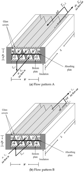 Consider the heat transfer in two subchannels with welding of the V-corrugated absorber plate to divide a parallel conduit of height H g , length L and width W , as shown in Figure 1a,b with the different air flow arrangements. Before entering the lower subchannel (flow pattern A), as shown in Figure 1a, the inlet air mass flow rate m ˙ and inlet temperature T i n is premixed with the recycling air flow R m ˙ exiting from the upper subchannel with the outlet temperature T a , L . The inlet air mass may flow through the upper channel firstly (flow pattern B), as shown in Figure 1b.