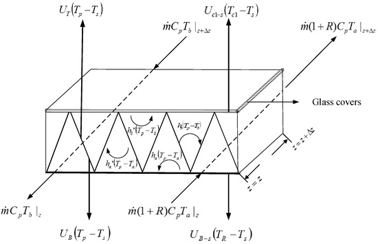 By following the same mathematical treatment and experimental methods performed in our previous work [16], except welding the V-corrugated absorber instead of packing wire mesh, the theoretical solutions of the temperature distributions of the flowing air in the lower and upper subchannels were obtained, making the energy balance on a finite system element, as shown in Figure 2. The various heat transfer coefficients at different components of the solar air heater were sketched in the thermal resistance network in Figure 3. The results are:
