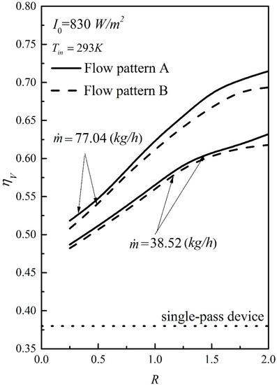 The recycling double-pass solar air collectors are welded to four units of V-shape stainless steel absorbing plate of 7 × 10−5 m thickness on the bottom plate to divide the air flow conduit of width W, length L, and height Hg into two subchannels, as shown in Figure 4 (flow pattern A). A photo of the experimental device was taken and shown in Figure 5. Three configurations of solar air collectors, such as the downward single-pass device, recycling double-pass wire mesh, and recycling double-pass V-corrugated absorber were investigated theoretically and experimentally. The experimental runs were conducted using a blower (Teco 3 Phase Induction Motor, Model BL model 552, Redmond Co, Owosso, MI, USA) to supply the ambient air, and the air mass flow rate was measured using an anemometer (Kanmax Japan Inc., Osaka, Japan). The device parameters [17] and operating conditions are as follows: L = W = 0.3 m; Hg = 0.062 m; ks = 46.64 W/m·K; τ g = 0.875; α p = 0.95; ε g = 0.94; ε p = 0.8; ε R = 0.94; I 0 = 830 and 1100 W/m2; T i n = 293,303 and 313 K; V = 1.0 m/s; m ˙ = 0.0107, 0.0161 and 0.0214 kg/s; T s = 293 K, σ = 5.68 × 10−8 W/m2·K4. The calculation methods for flow pattern B are similar to those in the previous section of flow pattern A. A comparison of both flow patterns in Figure 6 indicates a greater collector performance improvement in operating flow pattern A is higher than that in the flow pattern B. Therefore, all the theoretical predictions and experimental works were carried out using flow pattern A as an illustration in the present study. The evaluation procedure for collector efficiency is now described. With known device geometries (W, L, Hg), physical properties (ks, τ g , α p , ε g , ε p , ε R , C p , μ , ρ ) and the given operating conditions ( I 0 , T i n , V , m ˙ , T s ), a temporary η V is first estimated from Equation (7) using Equation (8a) for calculating T a , L once T p , m is assumed. The T p , m value is thus re-checked using Equation (8b) by continued iterations, and the final value η V was obtained until the last value meets the required convergence. The theoretical predictions were obtained by substituting the specified values of physical properties and operation conditions into the appropriate equations, and the results are represented in Figure 7 and Figure 8 for comparison. The influence of the recycle ratio on collector efficiencies of theoretical predictions and experimental results for various incident solar radiations, recycle ratios, and air mass flow rates are presented in Figure 7 and Figure 8, respectively.