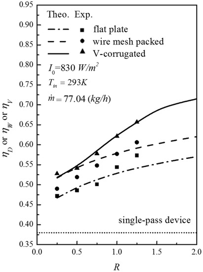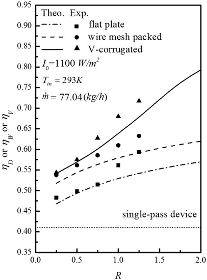 The calculation methods and procedures were performed exactly the same as those of our previous work [16], and thus, the results will be discussed. All the theoretical predictions and experimental results of η D , η W and η V increase with the recycle ratio and incident solar radiations, as seen from Figure 7 and Figure 8.