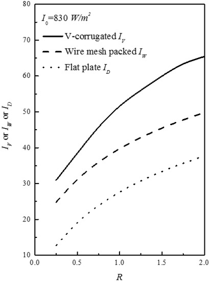 The effects of various recycle ratios and air mass flow rates on the ratio of both the efficiency improvement and the power consumption, I D / I P , D , I W / I P , W and I V / I P , V for various configurations were calculated and presented for comparison and for making an economic judgement to demonstrate feasible operating conditions. The higher value of I V / I P , V is obtained in operating recycling double-pass V-corrugated solar air collectors, as demonstrated in Figure 10. The extent of collector efficiency improvement is more notable with recycle ratio for the recycling double-pass V-corrugated solar air collectors than for the flat-plate and wire mesh packed devices. With this comparison, the advantage of the present design is evident.
