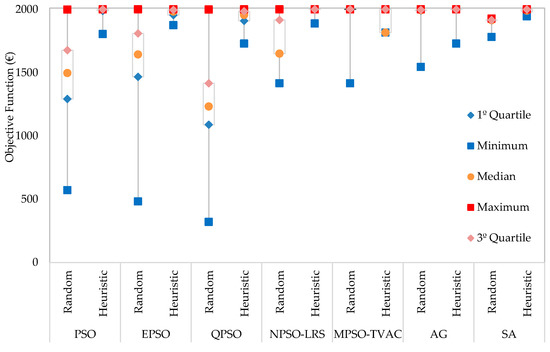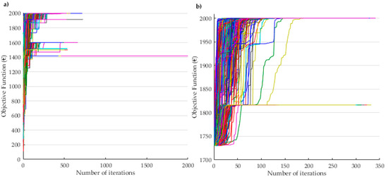 Figure 7 shows the performance of the MPSO-TVAC method when using a randomly generated solution and when using the proposed heuristic solution. This algorithm is chosen because it is the algorithm that achieved the highest maximum solution among all algorithms. It should be noted that the scales of the graph are different in Figure 7a,b. This representation is made because it is possible to observe better the differences between performances of two resolutions. In Figure 7 the yy scale starts at 1700 € because the minimal solution of 1000 runs in MPSO-TVAC (heuristic solutions) is 1730, and thus it is possible to see better the amplitude of the performance of the two algorithms.