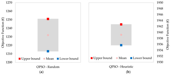 The 95% confidence interval for the QPSO with and without the proposed initial solution is represented in Figure 3. With the confidence interval one can analyse how reliable the algorithm is, because in this case there are 95% chances of running this algorithm for this problem and obtaining a result between the upper and lower limits, adding or subtracting a certain error. In this case as one can see from Figure 3b the confidence interval with the initial solution improved, as both the lower and upper limit values increased considerably (approximately 700 €).