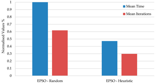 In Figure 4 the average of the execution time as well as the average of iterations for the EPSO method is presented. The EPSO is chosen because it was in this algorithm that it was possible to reduce the most the number of iteration and execution time.