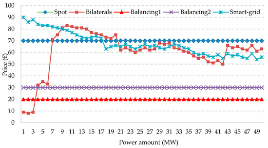As can be seen from Figure 5, some markets (spot and balancing market sessions) present a unique market price for this hour, while bilateral and smart-grid markets present prices that vary with the negotiated amount. The expected result is that the optimization allocates the sales to markets and amounts where the price is higher and purchases when the price is lower.