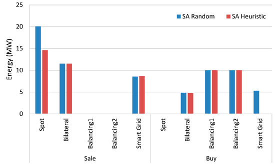 Figure 6 shows the energy purchased and sold in each market for the SA with random solution and with the proposed heuristic solution. The presented scheduling corresponds to the simulation in which both methods obtained the highest objective function solution, and as one can see, the difference is minimal.