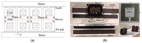 The section view of the magnetic path of the machine and its prototype are shown in Figure 2. This machine employs a bilateral structure to counterbalance the normal force of the mover. Both the stator and the mover involve a series of teeth and slots with identical width. The mover consists of two phases creating two sinusoidal currents. PMs are sandwiched by mover plates. As only four PMs are embedded in the mover, the generator is much cheaper than linear permanent magnet synchronized machines that employ many expensive PMs. Since the speed of the ocean wave is relatively low, the width of the teeth for the tested generator is designed as 1 mm so that the generation period of each phase can be relatively small in a short stroke of the machine. The length of the air gap between the mover and the stator can be ensured by eight bearings fixed on the mover. The main specifications of the machine are listed in Table 1.