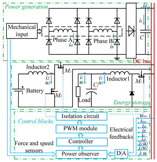 From the topology of the system given in Figure 3, the storage system includes a supercapacitor and a battery. There are three switches to control the charging current of the storage system. After getting the electricity from the DC bus, the charging current of the supercapacitor can be regulated by the switch of M1. Likewise, by adjusting the duty cycles of M2 and M3, the charging or discharging current of the battery can be controlled. The values of the charging current mainly affect the phase currents of the machine. The controller can calculate a suitable Pulse Width Modulation (PWM) duty for the three switches to achieve a maximal efficiency power generation via the output of the observer which gets the feedback reflecting the status of the generation system and the storage system. Meanwhile, the status of the DC bus and the mechanical input are also observed by the control block to guarantee the steadiness of the whole power generation system.