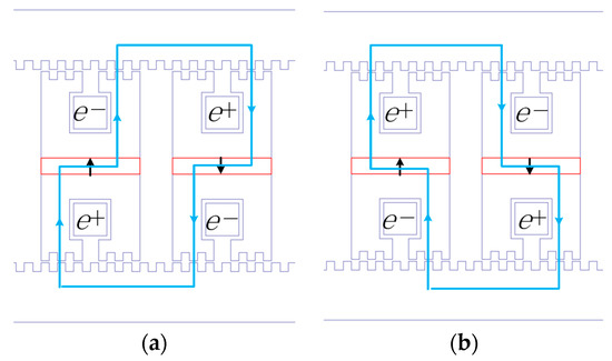 The operation principle of the machine is given in Figure 5. Taking phase A as an example, it can be seen that the flux lines go through the mover, the air gap, the stator, and finally back to the original place. Black arrows illustrate the polarizing directions of the PMs. Assuming that the positive and negative terminals of the coils are expressed as e+ and e−, respectively, in Figure 5a, when the mover moves to right direction, the flux lines along the direction shown will be weakened as the magnetic reluctance of the path increases. Therefore, the back electromagnetic force (EMF) of the coil during the first half period can be illustrated as the Figure 5a. Similarly, after the mover shifts 1 mm, the positive and negative terminals of the coil in the second half period can be shown as Figure 5b when the mover moves along the same direction mentioned.