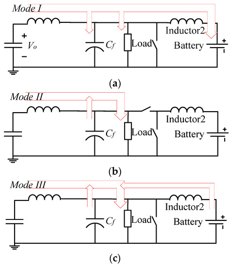 As for the energy storage system, there are three modes for the whole energy flow listed in Table 2. Assuming that the output of the machine is Po and it is larger than the loading power Pload, the extra energy will be absorbed and stored by a supercapacitor and a battery as shown in Figure 7a. After they are fully charged, switch one will be activated to regulate the power output of the machine. Figure 7b shows that if the loading power is larger than the output of the machine, the switch for charging battery will be closed and the supercapacitor will be discharged to the load. As the loading power increases, both the battery and the supercapacitor will be discharged to the load, which is mode III, as shown in Figure 7c.