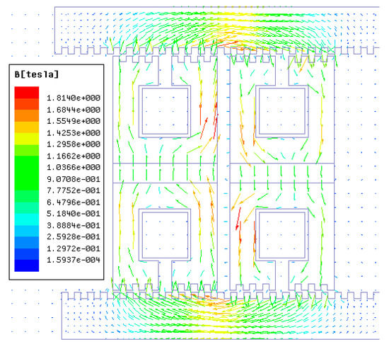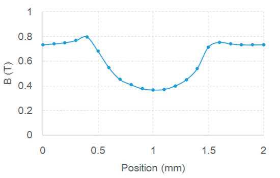The flux distribution of the machine is given in Figure 10. The density of the flux along the teeth aligned with the stator is higher than that of the teeth unaligned, so it obeys the principle mentioned in Figure 5. The B values of the air gap between the mover and the stator vs. the displacement of the mover are calculated as shown in Figure 11. The B value is nearly double that of the teeth shift from unaligned positions to unaligned positions.